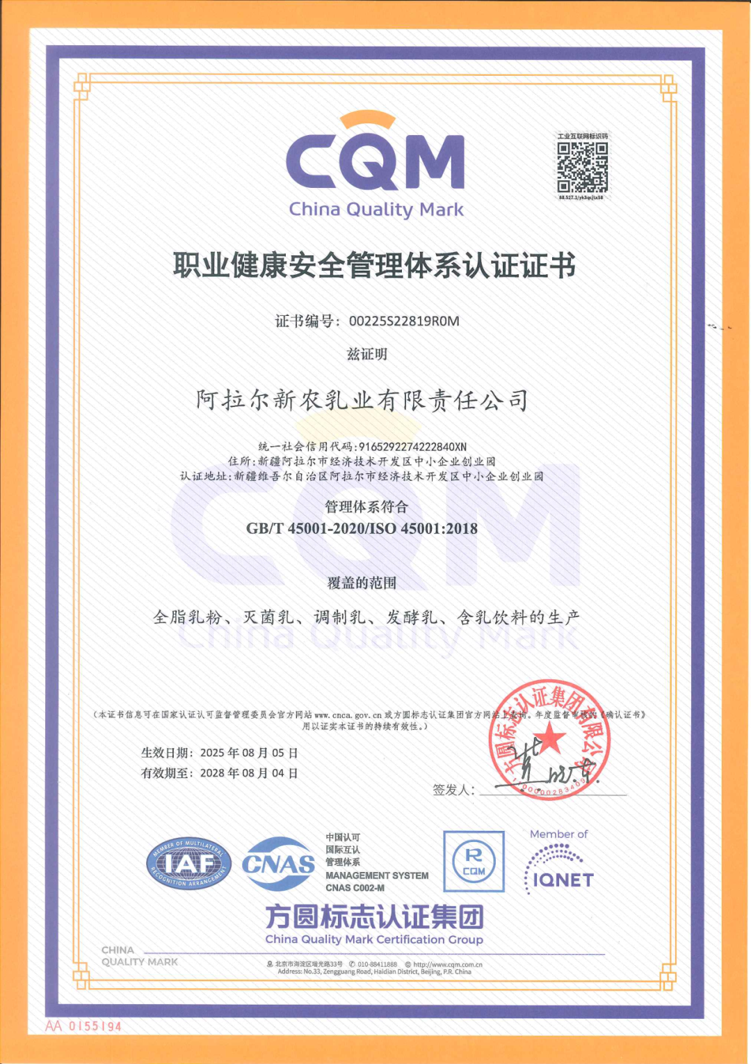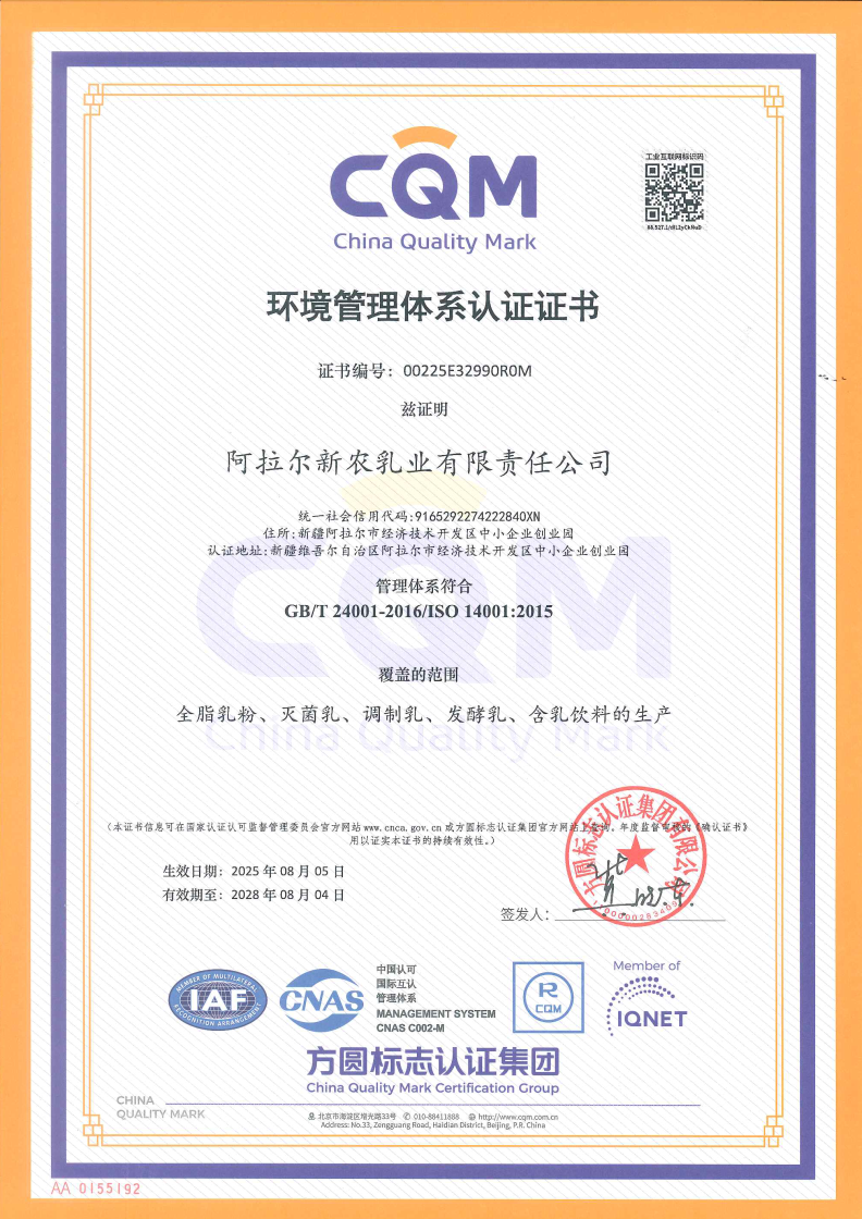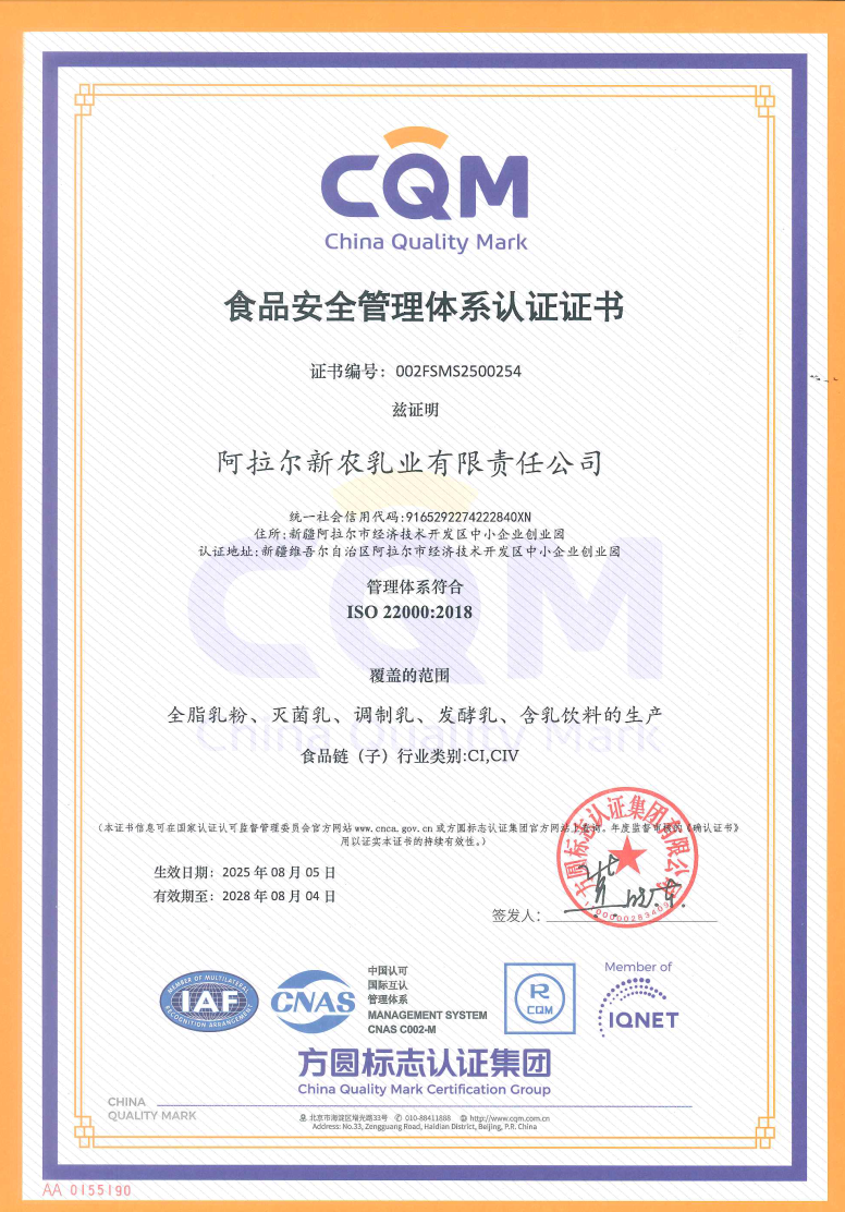 2025年8月5日,新农乳业顺利通过方圆标志认证集团审核,成功取得了食品安全管理体系、环境管理体系、职业健康安全管理体系认证证书。